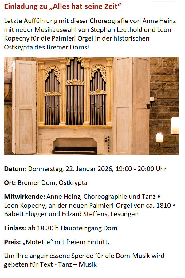 Anne Heinz, die mit Bernd Neumann den „KunstHof Bockhorn“ betreibt, sagt: „Mit dem Wetter im launischen Frühling haben wir keine Probleme. Bei gutem Wetter spielen wir draußen im wundervollen Garten, bei Regen in der großen Diele des Hofes! Der Eintritt ist frei und es geht ein Hut für Spenden rum.“